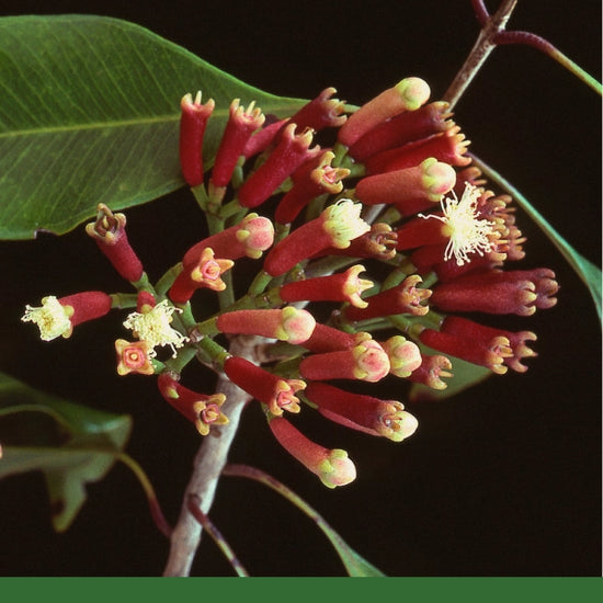 Clove is a small evergreen tree in the Myrtaceae or the Myrtle family, which also includes Myrtle, Pohutukawa, Bay Rum Tree, Guava, Acca, Allspice and Eucalyptus. All species are woody, contain essential oilS and have flower parts in multiples of four or five. The entire tree is highly aromatic and its Latin specific name aromaticum, refers to this intense aroma.